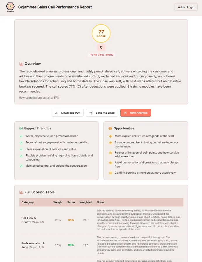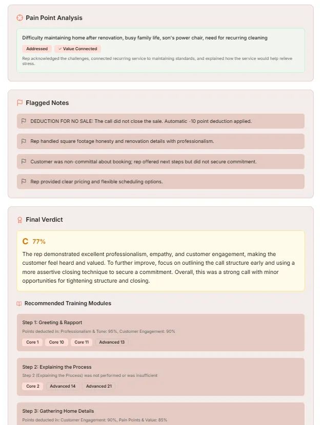 We measure tone, structure, engagement, authority, resolution, and psychological control — not just whether someone "sounded nice."