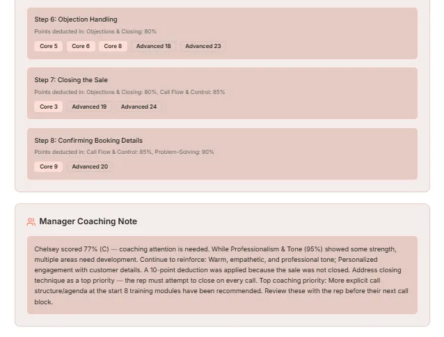 Your team must demonstrate execution across defined conversational stages — whether that's closing a sale or stabilizing a frustrated customer.